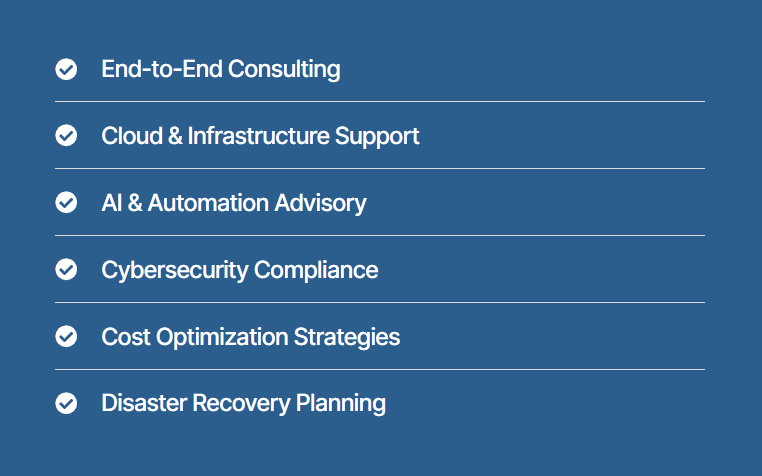 Optimize IT infrastructure, minimize downtime, and enhance security with expert consulting. We offer end-to-end solutions tailored to your needs, ensuring business continuity, performance enhancement, and risk mitigation—all while supporting seamless technological evolution for your success.
